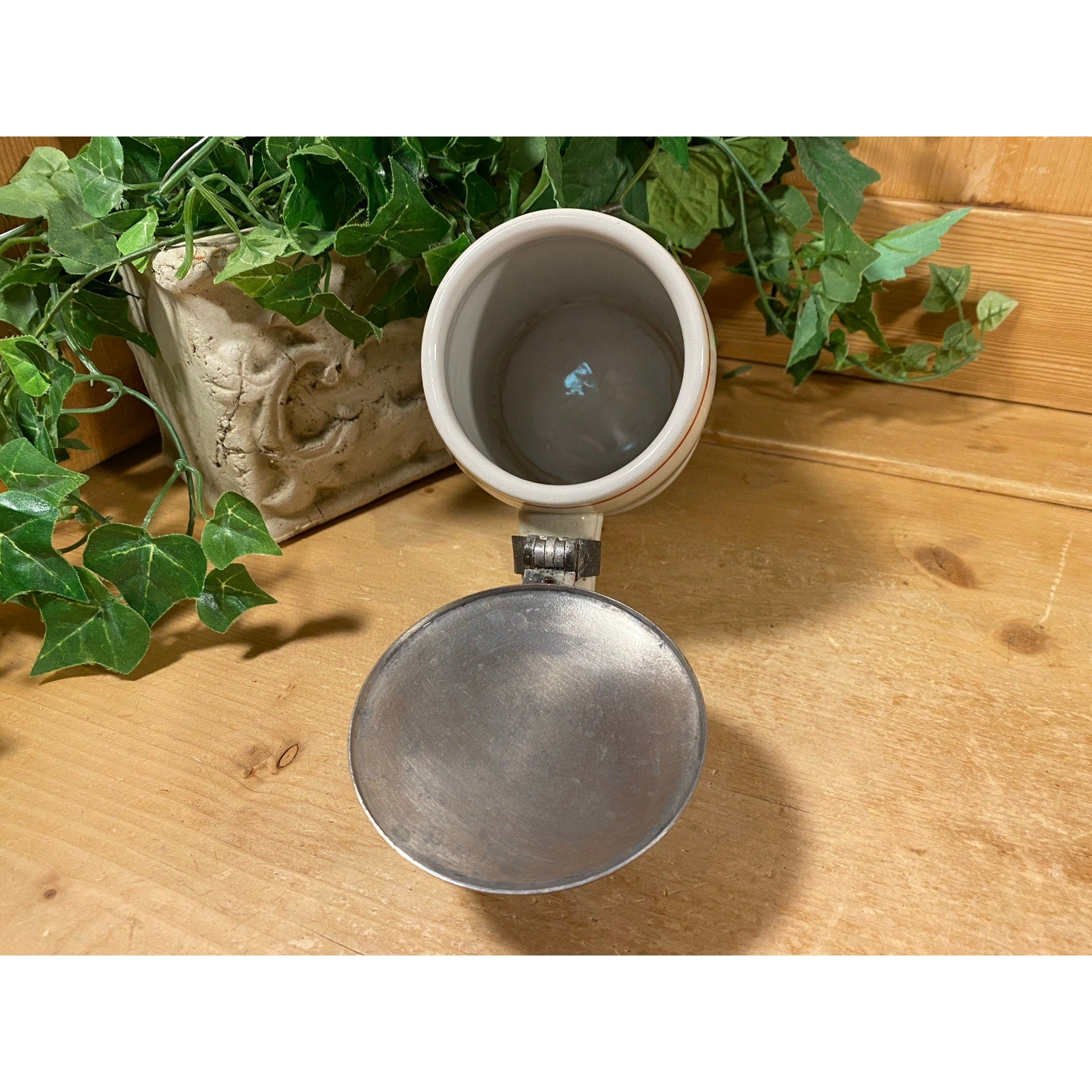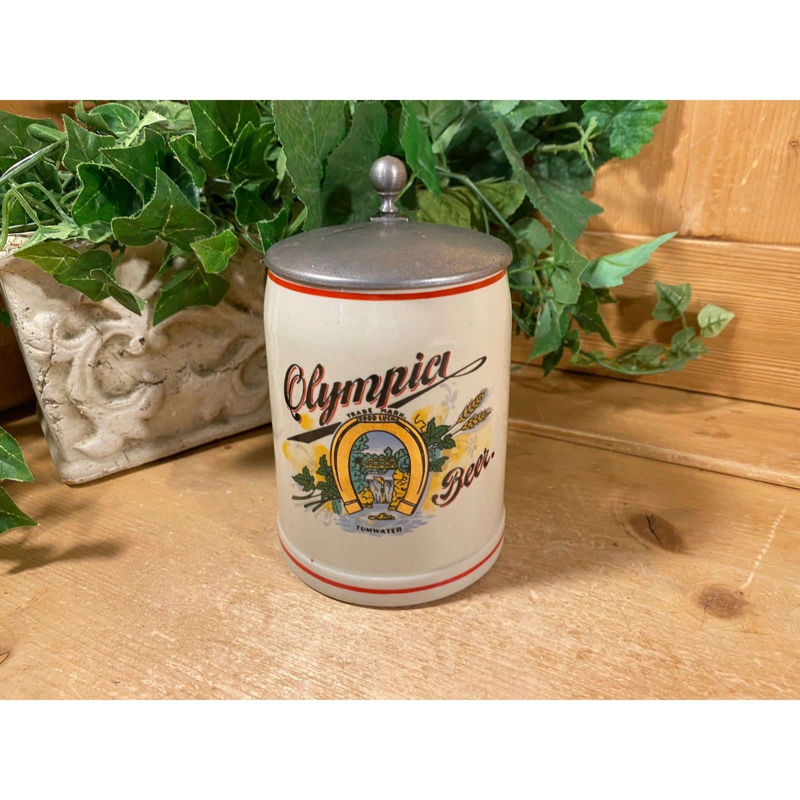 Vintage Ceramic Olympia Beer Stein | Good Luck Horseshoe | Tumwater | White Beer Mug with Pewter Lid | Ceramarte Beer Stein | Retro Barware