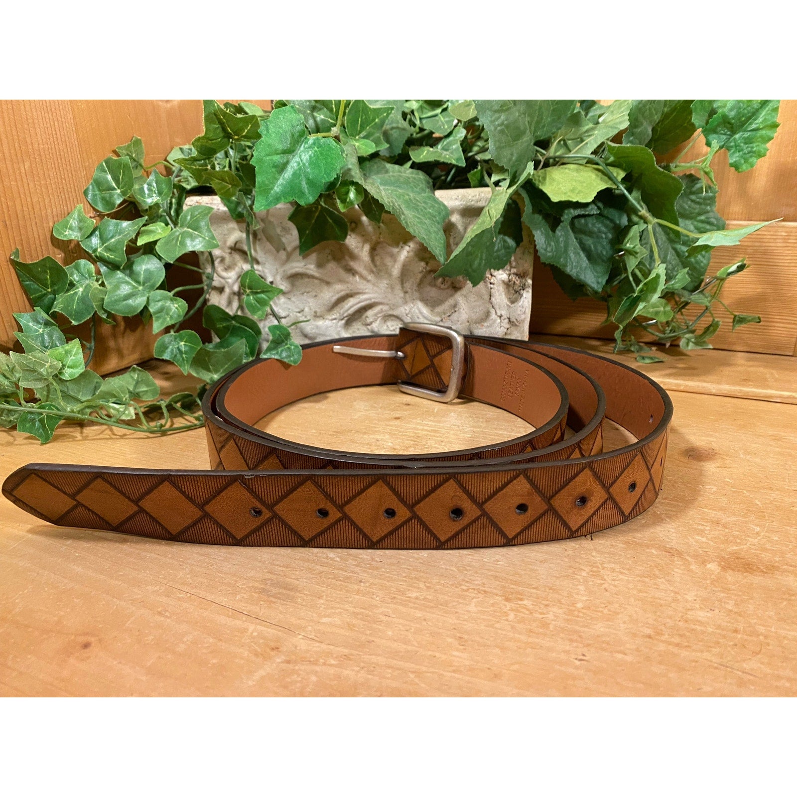 Vintage Mens Genuine Leather Belt with Stamped Diamond Pattern | 58x60 | Mens Western Wear | Stamped Leather Belt | Cowboy Style