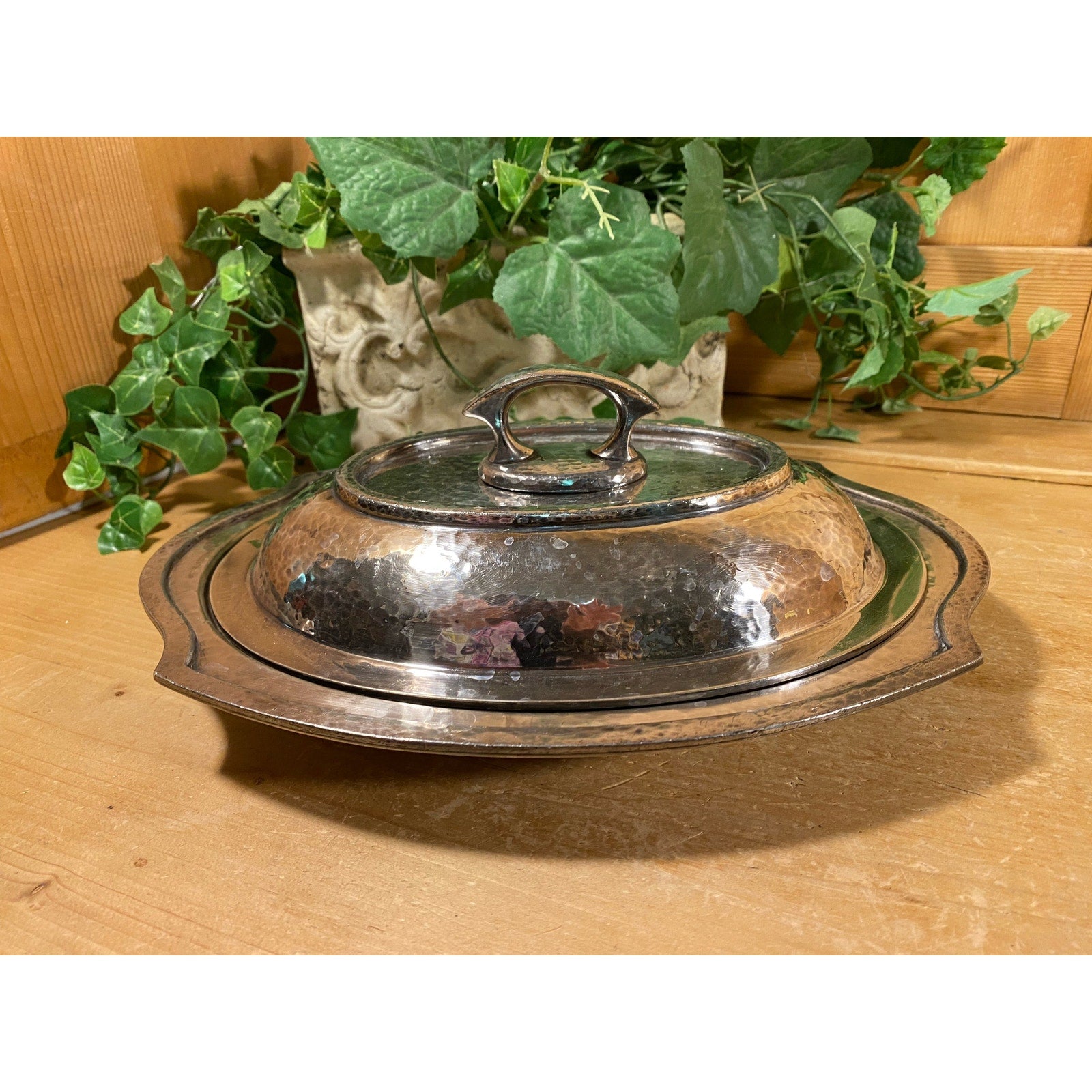 Vintage Silverplated Sheffield Reproduction Covered Platter | DSP Co. | NS 4410 | Oval Serving Platter w/ Hammered Silver Finish | Academia