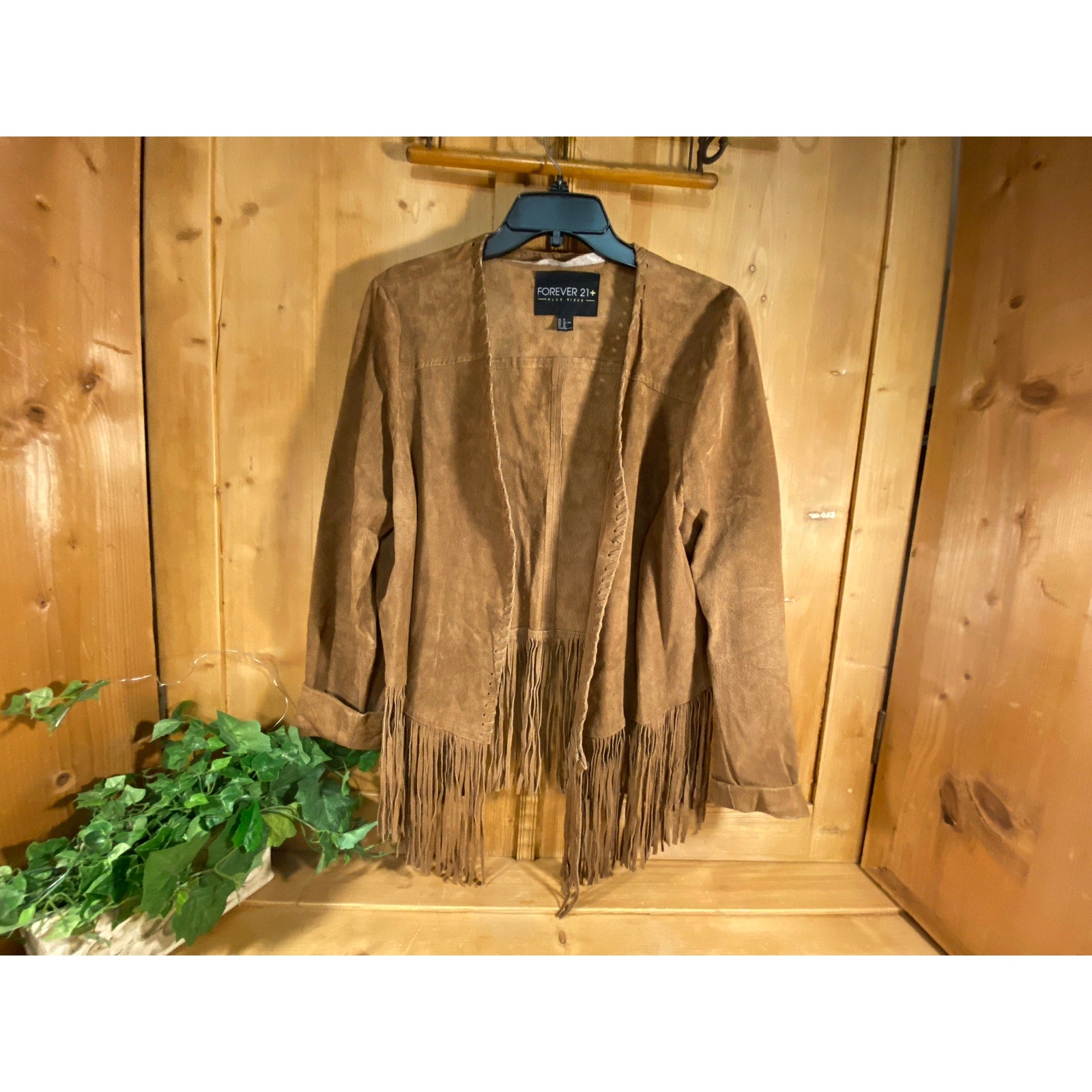 Vintage Western-Inspired Tan Blazer Jacket with Fringe Trim | Women's 1X | Forever 21 | Whip Stitching and Fringe Trim | Tan Fringed Jacket